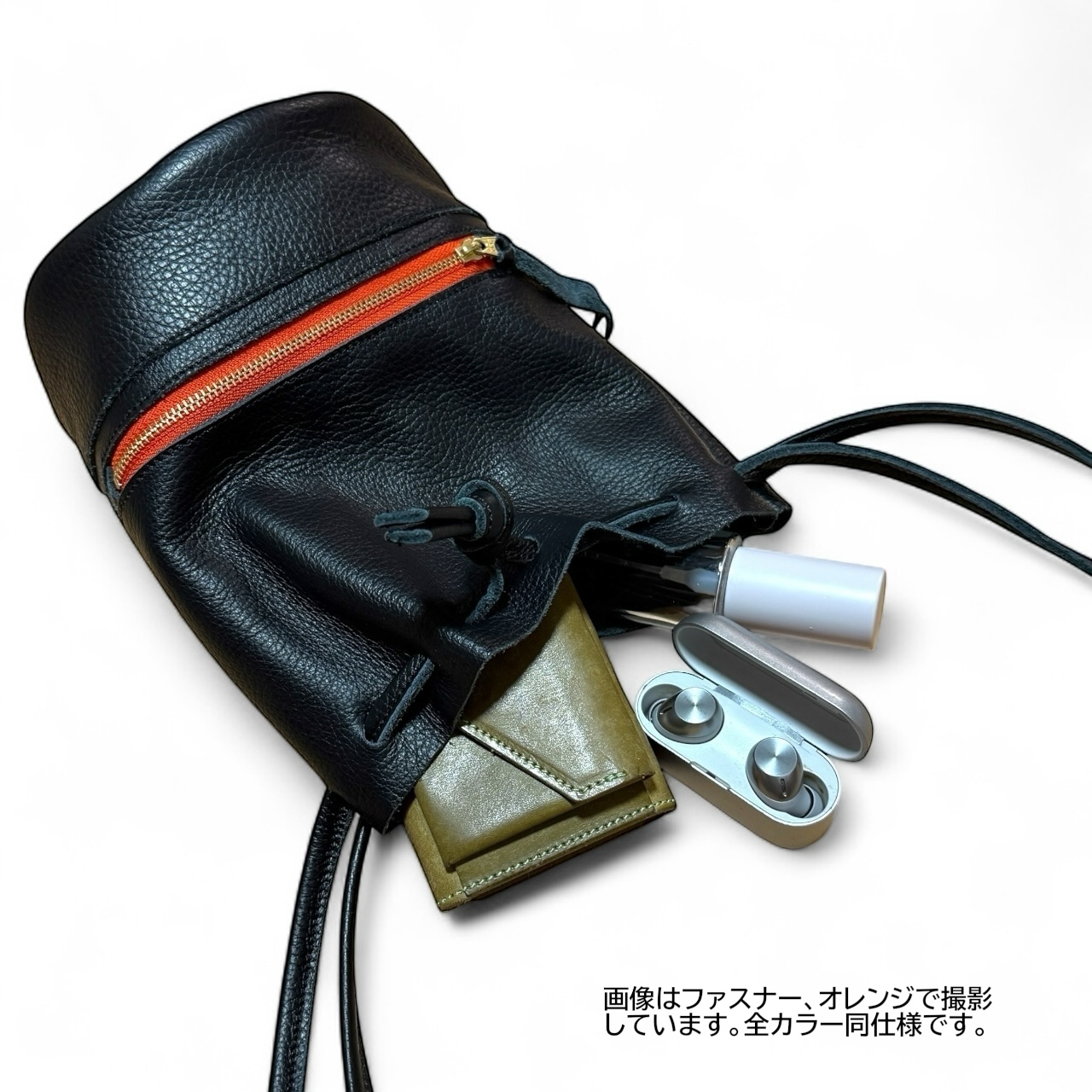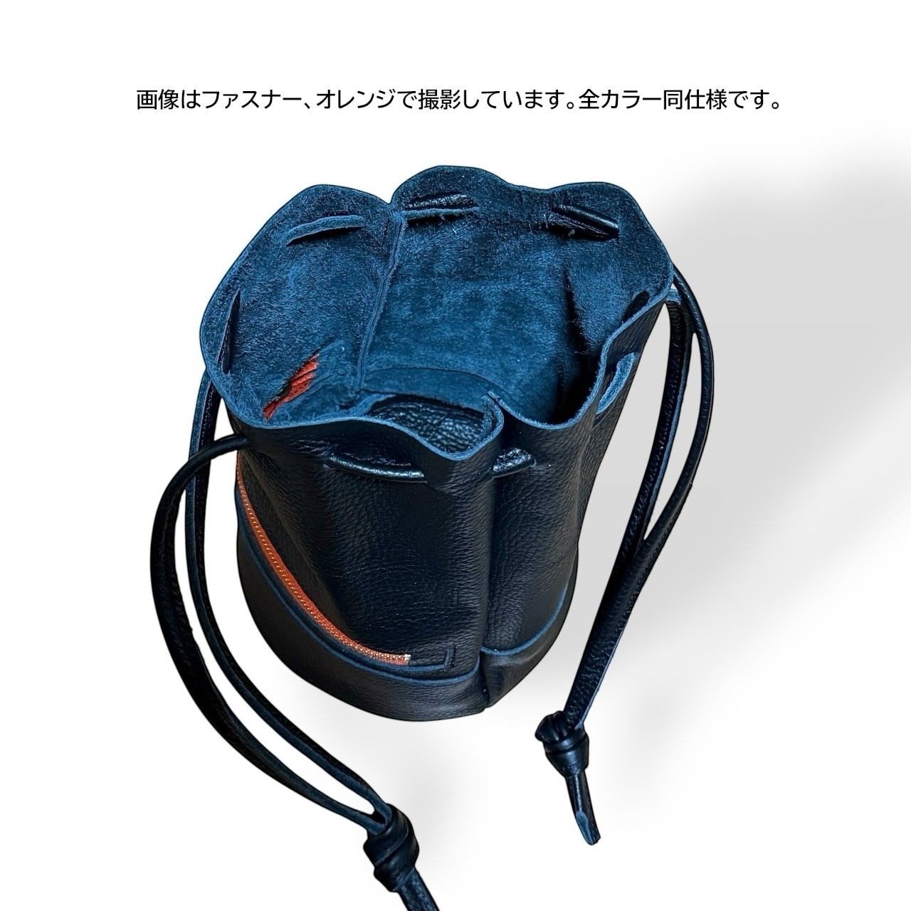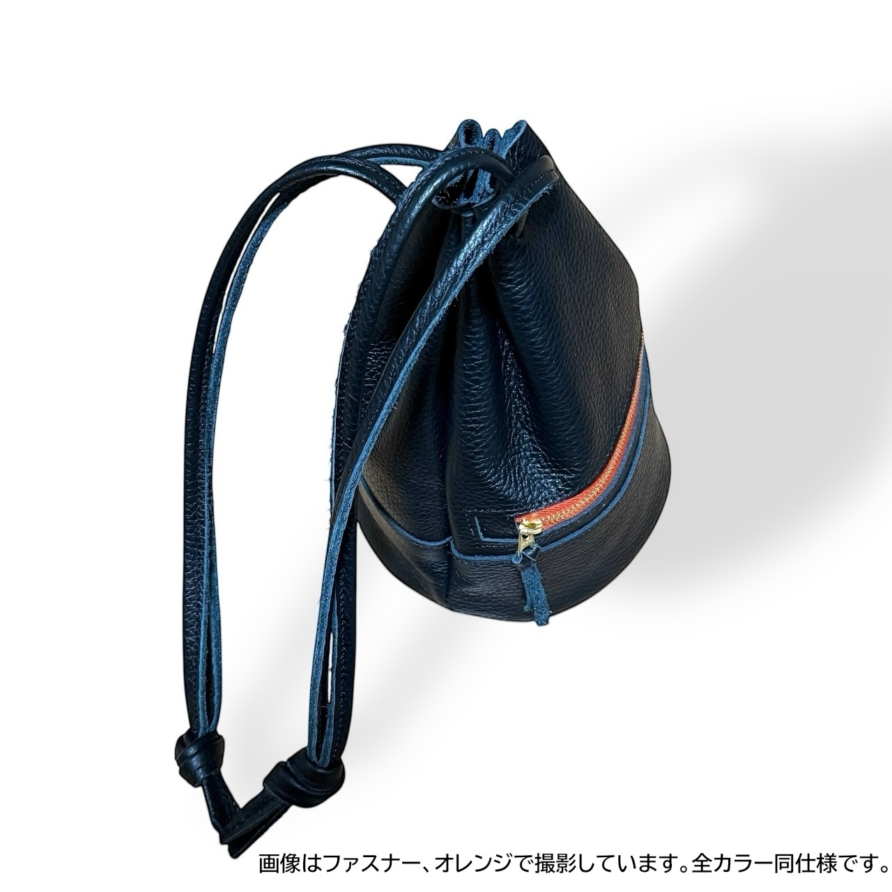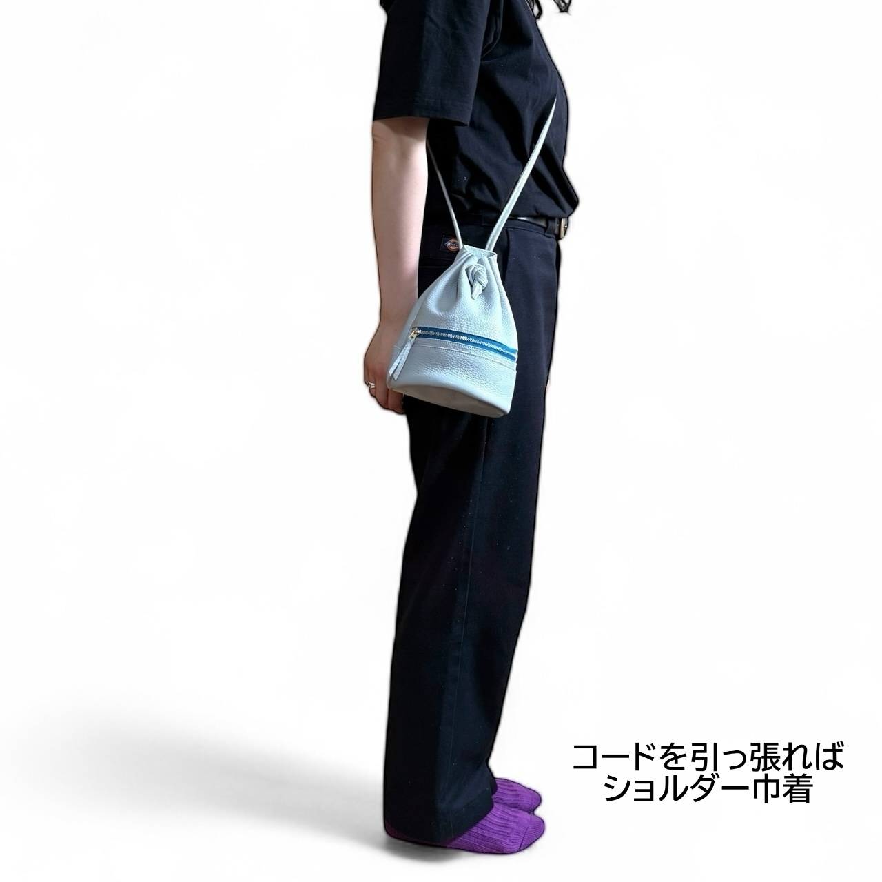 イタリア産クロームレザーの均一なシボと程よい光沢、柔らかな手触り。革紐を伸ばせばショルダー、絞れば巾着ハンドとして使える2wayミニバッグです。ファッション玄人にも響く上品な素材感と、日常での使いやすさを両立しました。