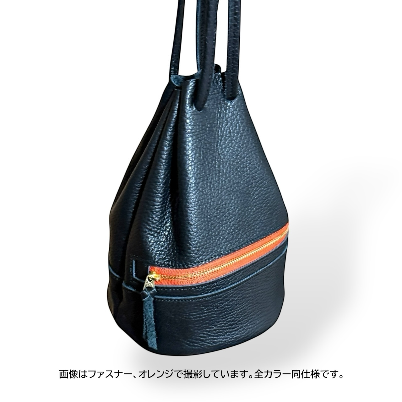 従来の巾着バッグは両手での開閉が必要。motivoは中央にファスナーを配し、片手で素早くアクセス可能に。さらにカラフルなファスナーがアクセントとなり、コーディネートの差し色にも活躍します。
